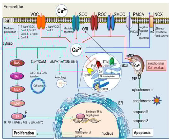 Ca2+-signaling in proliferation and apoptosis. [Ca2+]i homeostasis of the cell is strictly regulated by various channels and pumps on plasma membrane, ER, and mitochondria. Intracellular calcium flux is indicated by arrows where red arrows indicate influx of Ca2+ ions, blue arrows indicate Ca2+ efflux and sequestration of Ca2+ into the stores, and green arrows indicate cell signaling pathways which are activated by [Ca2+]i. Primarily Ca2+ influx from the extra-cellular space is controlled by VOC (voltage operated calcium channel), SOC (store-operated Orai channels), SMOC (second messenger-operated channel), or ROC (receptor-operated channel), and Ca2+ efflux is mediated via (NCX (Na+/Ca2+ exchanger) and PMCA (plasma membrane Ca2+-ATPase). Ca2+ release from the ER stores is facilitated via RyR (ryanodine receptors) and IP3R (IP3 receptor). Uptake of calcium from the cytosol is an energy driven process mediated by SERCA (sarcoplasmic/ER Ca2+-ATPase). Additionally, mitochondria and associated proteins (including mitochondrial calcium uniporter (MCU), voltage dependent anion channel (VDAC), and mitochondrial Na+/Ca2+ exchanger (mNCX) are also related to [Ca2+]i-regulation. Mitochondrial-Ca2+ controls ATP synthesis, apoptosis, ROS generation, and biosynthesis and can determine the fate of the cell. The concentration of Ca2+ in the cytosol is maintained at a low level (100 nM) in comparison to the extra cellular Ca2+ (1mM). Any change in the [Ca2+]i results in signal transduction initiating various cellular process such as apoptosis, proliferation, and cell division. The type of signal depends on the duration, amplitude, localization, frequency, and oscillation. Sustained high level of Ca2+ in the mitochondria causes the release of cytochrome c and subsequently triggers death signals via caspase activation. More Ca2+ influx from the ion channels on the plasma membrane can trigger either proliferation (via T-type) or apoptosis (via L-type). Increased Ca2+ entry through the SOC channel promotes proliferation [32].