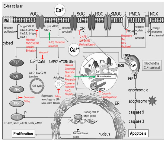 Anti-cancer drugs have multiple modes of action and, based on their mechanism of action, can interfere at the DNA level, act as antimetabolites, inhibit enzyme synthesis, and inhibit microtubule function. In the past decade, much attention has been drawn to calcium signaling. Altered calcium signaling is crucial for the development and progression of cancer through the induction of proliferation, invasion, and metastasis [70]. Figure 2 and Table 1 summarize anti-cancer drugs and their [Ca2+]i mediated induction of cell death.