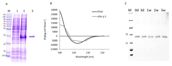 Structural analysis. (A). The gel stained with Coomassie brilliant blue shows a single band of 27 kDa corresponding to purified DPx4. M: Molecular weight marker. Lane 1: non-induced culture. Lane 2: culture induced with Isopropyl-1-β-thiogalactopyranoside (IPTG). Lane 3: Purified DPx4 protein. (B) Circular dichroism spectra of DPx4 and nDer p 1; spectra were recorded from 190 to 260 nm (x-axis) and circular dichroism (CD) values converted to mean-residue ellipticities (y-axis). (C) Stability of DPx4 upon extended storage (0–21 days).