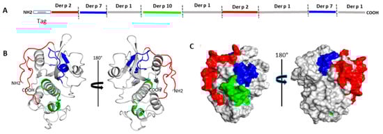 Schematic representation of DPx4 structure. (A). Order of segments in the DPx4 primary structure. (B) Cartoon representation, each segment is colored in the three-dimensional (3D) model in accordance to the antigenic segment defined above. (C) Surface color representation of the allergen segments included in the structure.
