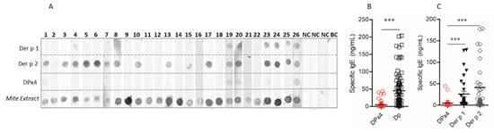 Serum IgE levels as detected by ELISA. (A) Non-denaturing dot blot showing the IgE reactivity of sera from 26 allergic patients (lanes 1–26), three non-allergic individuals (NC) and buffer alone (BC) in the nitrocellulose blotted proteins. (B) IgE reactivity to DPx4 and mite extract in 90 serum samples from allergic patients. (C) IgE reactivity to DPx4, Der p 1, and Der p 2 in sera from 32 random-selected allergic patients (*** p < 0.001).