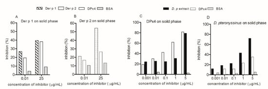 The ELISA inhibition assay showed that, at 25 μg/mL, DPx4 inhibited the IgE reactivity of serum pool A to Der p 1 and Der p 2 by 38% and 26%, respectively (Figure 4A,B). D. pteronyssinus extract inhibited the IgE reactivity to DPx4 at the highest concentration by 78.3%, which was similar to the rate that was obtained in the homologous inhibition (Figure 4C), while DPx4 inhibited IgE reactivity to D. pteronyssinus extract up to 35.1% (Figure 4D). These results indicate that an important number of the IgE-binding epitopes of allergens that are present in the extract and purified allergens are on DPx4. No inhibition was observed while using BSA as inhibitor. In addition, these results are supported by data from the dot blot assay using the monoclonal antibodies anti-Der p 1 and anti-Der p 2, which showed the reactivity of these antibodies against DPx4 (Figure S3).