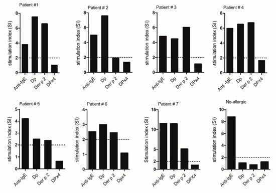 Basophil activation test. Stimulation index obtained in samples from seven allergic patients stimulated with anti-IgE, Dp (extract), Der p 2, and DPx4.