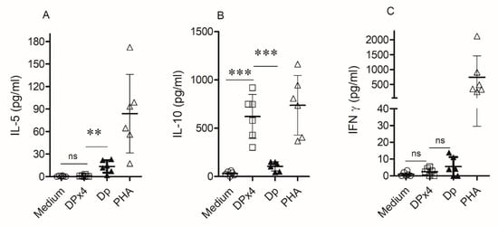 Previous to analysis purified DPx4 and mite extract were subjected to affinity chromatography while using the ToxinEraser™ Endotoxin Removal Resin Kit (Piscataway, NJ, USA). The concentration of LPS was determined using the ToxinSensor Chromogenic LAL Endotoxin Assay kit (Piscataway, NJ, USA). The content of LPS in the culture supernatant was 0.07 EU/mL for DPx4 and 0.02 EU/mL for mite extract. The PBMCs were obtained from fresh blood of six allergic patients by Ficoll (Sigma-Aldrich) density gradient centrifugation. The cells were cultured in RPMI with 10% heat-inactivated fetal bovine serum, 31 µg/mL penicillin, 50 μg/mL streptomycin, and 2 mM l-glutamine in 24 well plate (flat bottom plate; Costar, Cambridge, U.K.) at 1 × 106 /mL per well in 500 µL of RPMI. The cell cultures were stimulated with DPx4 at final concentration of 1 µM or 25 µg/mL of D. pteronyssinus extract. Phytohaemagglutinin A (PHA) [5 μg/mL] was used as a positive control of immune cell activation. The cells were incubated for six days at 37 °C in a 5% CO2 humidified air atmosphere. The supernatants were collected after centrifugation and then stored at −70 °C until assessment of cytokine levels.