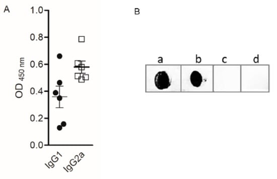 DPx4-specific IgG1 and IgG2a in serum were determined by ELISA while using MaxiSorp plate wells (Nunc, Thermo Fisher) that were coated with 1 µg/mL of DPx4. In addition, we evaluated whether IgG antibodies induced by immunization reacted with mite extract by dot blot assay, using nitrocellulose membrane that was dotted with 5 µg of allergen extract, as described in [43]. An ELISA inhibition test was performed using MaxiSorp plate wells that were coated with 5 µg of D. pteronyssinus extract and serum pool from the immunized mice with DPx4 to test whether the IgG antibodies could inhibit the human IgE binding to D. pteronyssinus extract, as described previously [43].