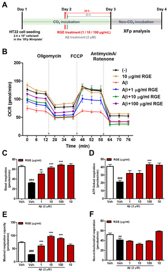 HT22 cells were seeded in XFp Miniplate at a density of 2.4 × 103 cells/well. Twenty-four hours later, the cells were treated with RGE (1, 10 or 100 μg/mL) and Aβ1-42 (2 μM; Bachem, Bubendorf, Switzerland) sequentially, followed by XFp analysis (Figure 1A). OCR was measured according to the manufacturer’s protocol using a Seahorse XFp Cell Mito Stress Test Kit (Agilent Technologies, Santa Clara, CA, USA) with Seahorse XFp Analyzer (Agilent Technologies). The Seahorse XF base medium used during the XFp analysis procedure was reconstructed with d-glucose (4.5 mg/mL), l-glutamine (584 μg/mL), and sodium pyruvate (110 μg/mL). The final well concentrations of loaded compound per port of the sensor cartridge were designated as follows: Port A (1 μM oligomycin), Port B (1 μM FCCP), and Port C (0.5 μM rotenone/antimycin A). The OCR in pmol/min was measured every 6 min; the ports of the sensor cartridge were opened one by one in alphabetical order at the end of every three measurements, and the compounds were released to each well of the XFp Miniplate. The analysis results obtained by triplicate repetition were automatically calculated and integrated by the XF Cell Mito Stress Test Report Generator software (version 2.6.0.31).