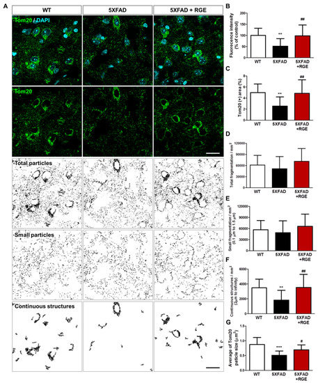 The imbalance in mitochondrial dynamics, in which fusion and fission proteins coexist, is a seminal event leading to aberrant mitochondrial fragmentation and neurodegeneration [32,33]. To investigate the effect of RGE treatment on disruption of mitochondrial dynamics, we performed immunohistochemical staining with antibodies against anti-translocases of mitochondrial outer membrane 20 (Tom20), which is a marker for the mitochondrial outer membrane, in hippocampal formations, including the subiculum, of 5XFAD mice. For quantitative and morphological analysis of mitochondrial dynamics, Tom20 (+) areas were reconstructed by threshold and size distribution using Image J software (Figure 2A). The immunoreactive areas and fluorescence intensity of Tom20 were remarkably diminished in 5XFAD mice compared with those in wild-type (WT) mice, whereas RGE administration significantly suppressed this diminishment (Figure 2B,C). In the reconstructed results for Tom20 in the subiculum, there was no significant difference between the three groups in terms of the total fragmentation and the small fragmentation (Figure 2D,E). The continuous structure and average size were significantly higher in the subiculum of 5XFAD mice in comparison with those in WT mice. However, the 5XFAD mice that received RGE exhibited improvement in continuous structure and average size in the subiculum of vehicle-treated 5XFAD (Figure 2F,G). These results indicate the protective effect of RGE on the imbalance in mitochondrial fusion and fission during Aβ-induced mitochondrial dysfunction in the brain with AD.