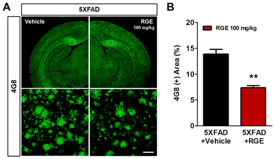 Effects of RGE on Aβ accumulation in the subiculum of 5XFAD mice. (A) Immunohistochemical analysis of Aβ burden was performed with the 4G8 antibody in the subiculum of 5XFAD mice (scale bar = 100 μm). (B) 4G8 (+) areas were significantly reduced in the subiculum in RGE-treated 5XFAD mice compared with those in vehicle-treated 5XFAD mice. Data are presented as mean ± SEM. ** p < 0.01.