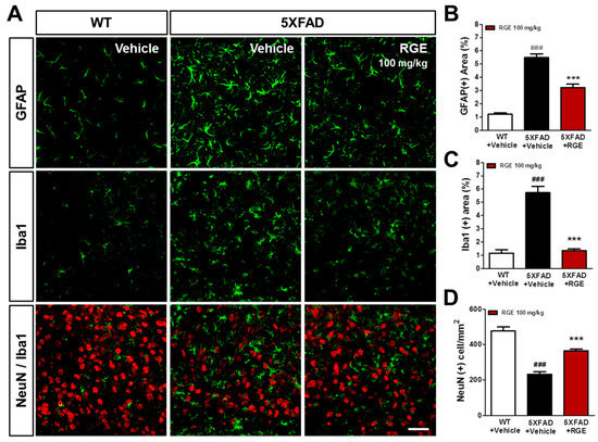 Effects of RGE on neuroinflammation in the subiculum of 5XFAD mice. (A) Immunofluorescent staining was conducted with the markers of microglia (ionized calcium-binding adapter molecule 1, Iba-1), astrocytes (glial fibrillary acidic protein, GFAP), and neurons (neuronal nuclei, NeuN) in the subiculum (scale bar = 100 μm). (B) The significantly greater GFAP-positive areas in 5XFAD mice compared to those in WT mice were significantly reduced by RGE administration. (C) The significantly greater Iba1 (+) areas in 5XFAD mice compared to those in WT mice were significantly reduced by RGE administration. (D) The number of NeuN (+) cells per area was significantly reduced in 5XFAD mice compared to those in WT mice and significantly improved by RGE administration. Data are presented as mean ± SEM. *** p < 0.001: vehicle-treated WT mice (white bar) versus vehicle-treated 5XFAD mice (gray bar). ### p < 0.001: vehicle-treated 5XFAD mice versus Aβ + RGE-treated 5XFAD mice (black bar).