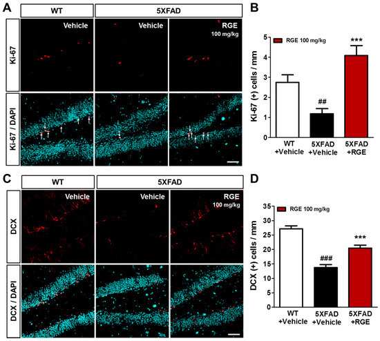 Adult hippocampal neurogenesis, known to play a significant role in the regulation of cognitive function [40,41,42,43], is altered in the AD brains of animal models and patients [8,44,45]. In addition, mitochondria are known to play a crucial role in adult neurogenesis [46,47]. Therefore, restoration of impaired hippocampal neurogenesis has been suggested as a therapeutic strategy for AD [8,48]. Although the administration of RG has been reported to improve cognitive function in AD patients [25,26,49], no evidence has been provided for the effect of RGE on hippocampal neurogenesis. To investigate the effect of RGE on the impaired adult hippocampal neurogenesis in 5XFAD mice, immunofluorescent staining was performed with the Ki-67 antibody, a marker of proliferation, and the doublecortin (DCX) antibody, a marker of neuronal precursors in the subgranular zone (SGZ) of the hippocampus (Figure 5A,B). The number of Ki-67 (+) and DCX (+) cells per SGZ length significantly reduced in the 5XFAD mice in comparison with the vehicle-treated WT of 5XFAD mice. However, RGE administration restored the reductions in the number of Ki-67 (+) and DCX (+) cells in the SGZ of 5XFAD mice (Figure 5C,D). To our knowledge, these results are the first histological evidence that RGE treatment improves the impaired adult hippocampal neurogenesis in brains with AD.