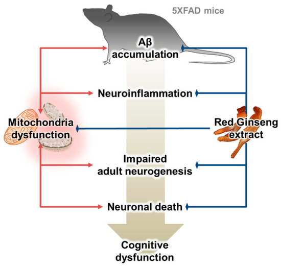 Since the roles of Aβ in the pathogenesis of AD have been extensively investigated, the importance of the roles of mitochondrial dysfunction in AD is increasing. Although a number of studies have reported the beneficial effects of RG on Aβ-mediated pathologies, there were no studies examining its effects on mitochondrial dysfunction in AD. Moreover, there is no histological study examining the effect of RG on the AD pathologies induced by Aβ. Therefore, we studied the effects of RGE on mitochondrial dysfunction and Aβ-mediated pathologies. Here, we report that RGE ameliorates mitochondrial dysfunction and Aβ-mediated pathologies, including Aβ deposition, gliosis, and neuronal loss, and decreased adult hippocampal neurogenesis in 5XFAD mice, an animal model of AD (Figure 6).