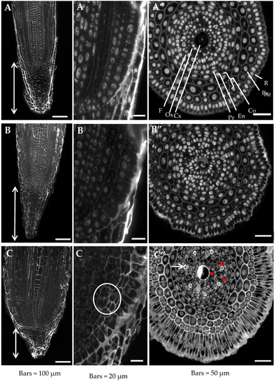 An analysis of the longitudinal sections of the roots clearly showed disturbances in cell division in the root meristematic zone, which led to an altered cortex cell arrangement (Figure 1C’, marked with a circle). Moreover, the Al-treated roots had clearly differentiated central and outer metaxylem vessels (Figure 1C” arrowheads) and xylem fibers (Figure 1C” arrow) compared to the control.