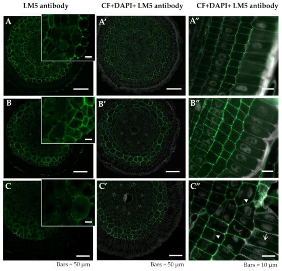 Distribution of LM5 epitope in cross sections in differentiated zone (A,A’–C,C’) and longitudinal sections in meristematic zone (A”–C”) of root tissues of barley cv. Sebastian. (A–A”)—control pH 6; (B–B”)—control pH 4; (C–C”)—30 µM AlCl3. (A–C) insets—higher magnification of cortex cells. Detection of LM5 epitope (A–C), Calcofluor (CF) and DAPI staining with immunolocalization of LM5 epitope (A’–C’, A”–C”) are shown. (B”,C”)—arrowheads show newly arising cell walls in exodermis and cortex with presence of LM5 epitope, arrow shows the newly formed anticlinal wall with LM5 epitope absent. Epitope distribution in representative sections are shown.