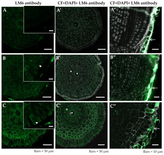 Distribution of LM6 epitope in cross sections in differentiated zone (A,A’–C,C’) and longitudinal sections in meristematic zone (A”–C”) of root tissues of barley cv. Sebastian. (A–A”)—control pH 6; (B–B”)—control pH 4; (C–C”)—30 µM AlCl3. (A–C) insets—higher magnification of rhizodermal cells. Detection of LM6 epitope (A–C), Calcofluor (CF) and DAPI staining with immunolocalization of LM6 epitope (A’–C’, A”–C”) are shown. (B,C)—arrowheads within insets show the presence of LM6 epitope in cytoplasmic compartments in rhizodermal cells, (B’,C’)—asterisk symbols show the xylem cells with presence of LM6 epitope, A”–C” —arrows show the remnants of root cap cells with the LM6 epitope recognized. Epitope distribution in representative sections are shown.