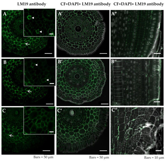 Distribution of LM19 epitope in cross sections in differentiated zone (A,A’–C,C’) and longitudinal sections in meristematic zone (A”–C”) of root tissues of barley cv. Sebastian. (A–A”)—control pH 6; (B–B”)—control pH 4; (C–C”)—30 µM AlCl3. (A–C) inset—higher magnification of cortex with intercellular spaces. Detection of LM19 epitope (A–C), Calcofluor (CF), and DAPI staining with immunolocalization of LM19 epitope (A’–C’,A”–C”) are shown. (A–C)—arrowheads within the insets show fibers with LM19 epitope. (A–C)—arrows show developing intercellular spaces with LM19 epitope recognized. Epitope distribution in representative sections are shown.