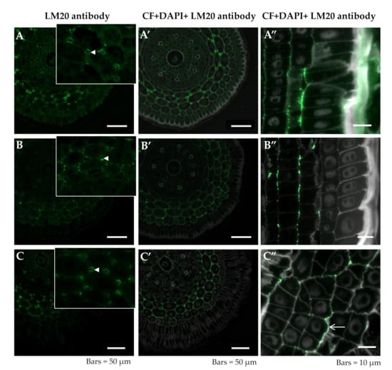 Distribution of LM20 epitope in cross sections in differentiated zone (A,A’–C,C’) and longitudinal sections in the meristematic zone (A”–C”) of root tissues of barley cv. Sebastian. (A–A”)—control pH 6; (B–B”)—control pH 4; (C–C”)—30 µM AlCl3. (A–C) insets—higher magnification of cortex cells with developing intercellular spaces. Detection of LM20 epitope (A–C), Calcofluor (CF), and DAPI staining with immunolocalization of LM20 epitope (A’–C’,A”–C”) are shown. (A–C)—arrowheads within insets show developing intercellular spaces with LM20 epitope recognized. C”—arrow shows the LM20 signal in the outer wall of cell from the complex arising from the cortex “mother” cell division. Epitope distribution in representative sections are shown.