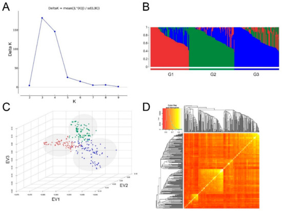 Population structure analysis of the soybean association panel using 8148 single nucleotide polymorphisim linkage disequilibrium blocks (SNPLDB) markers. (A) Estimation of the number of subpopulations using the STRUCTURE program. Delta K shows K = 3 as the most likely number of subpopulations. (B) Population structure bar plot at K = 3 inferred by the STRUCTURE program. Each bar represents one accession, and the bars are filled by colors representing the likelihood of membership to each subpopulation. G1 (red), G2 (green), and G3 (blue) denote three subpopulations. (C) Scatter plot of the top three eigenvectors (EV1, EV2, and EV3) with the largest eigenvalues of the genetic similarity coefficient matrix based on SNPLDB markers, which were calculated by restricted two-stage multi-locus genome-wide association analysis (RTM−GWAS) software. Each dot in the scatterplot represents an accession. Accessions are colored according to the subpopulation they were assigned to by STRUCTURE at K = 3. (D) Heatmap of genetic similarity coefficient matrix based on SNPLDB markers.