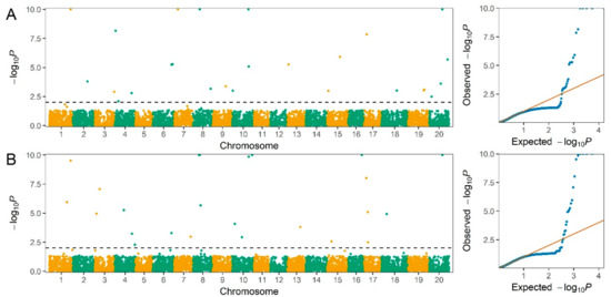Manhattan and quantile-quantile plots illustrating GWAS for seed protein content (A) and oil content (B) based on SNPLDB markers using the RTM-GWAS procedure in the soybean association panel. The horizontal dotted black line indicates the genome-wise significance threshold of 0.01, where the −log P values of SNPLDB markers for seed protein content and oil content range from 2.1 to 56.1 (A) and 2.3 to 55.0 (B), respectively. The −log p values greater than 10.0 are shown as 10.0.