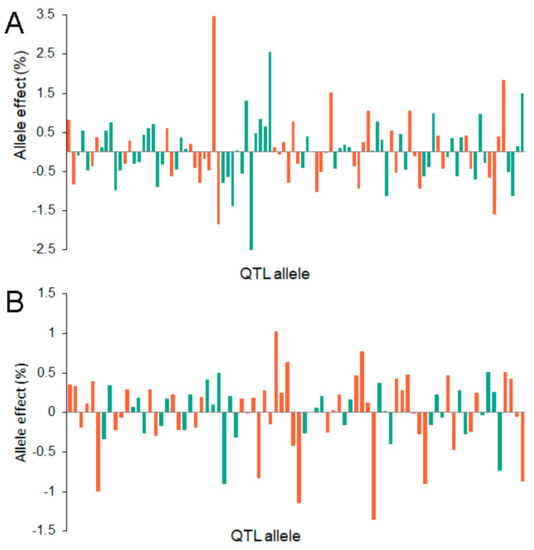 There were 98 alleles on 26 QTLs for seed protein content and 80 alleles on 23 QTLs for oil content, and their allele effects were estimated using the RTM-GWAS procedure. The number of alleles for each QTL ranged from 2 to 11 for both traits, and the QTLs qProt-8-1 and qOil-8-2 had the largest number of alleles. There were 48 and 45 positive (increased protein or oil content) and 50 and 35 negative (decreased protein or oil content) alleles for seed protein and oil content, respectively. The allelic effect sizes ranged from −2.50% to 3.47% for seed protein content, and −1.36% to 1.02% for seed oil content, while the majority of the allele effects varied between −1% and 1% (Figure 3A).