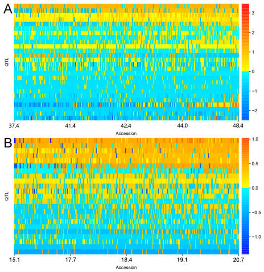 As shown in Figure 4, the allele effects of the detected QTLs in the 279 soybean accessions were organized into 26 × 279 and 23 × 279 (QTL × accession) QTL–allele matrices for seed protein and oil content of the soybean association panel, respectively. These QTL–allele matrices encompassed the genetic constitution of the population, including QTLs and corresponding allele effects and frequencies. No accession contained all negative or all positive alleles on all detected QTLs for either seed protein or oil content, and the accessions of high protein content (or oil content) had more positive alleles than those of low protein content (or oil content). The difference between high and low protein content (or oil content) accessions resulted from the different compositions of the positive and negative alleles. Most notably, there were many positive alleles in low protein content (or oil content) accessions and negative alleles in high protein content (or oil content) accessions, suggesting that seed protein and oil content possessed large recombination potential in the association panel.
