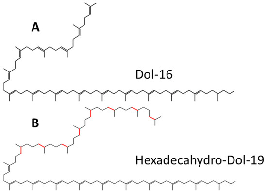 Dominant dolichols in S. cerevisiae (A) and in Trichoderma (B). Additional saturated bonds at the omega end in dolichol from Trichoderma in red.
