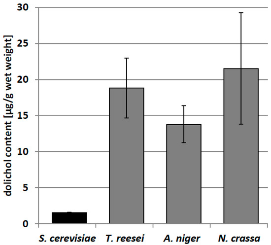 Dolichol content in yeast and filamentous fungi. Data are mean ± standard deviation from three independent experiments.