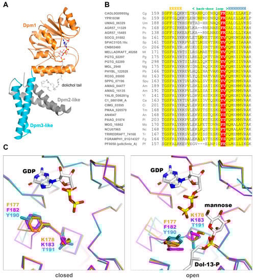 This enzyme has an architecture different from both Type I and II DPMSs since its single subunit carries two additional transmembrane subdomains at the C-terminus. These additional fragments lack detectable sequence similarity to Dpm2 or Dpm3 from fungi or any other Eukaryote. Yet, PfDPMS is still highly similar in sequence to the fungal Dpm1s (42% and 37% amino acid sequence identity to Dpm1 from S. cerevisiae and T. reesei, respectively). Structural study on PfDPMS has provided invaluable information about the dolichol binding mode. Based on the P. furiosus PfDPMS structures solved in two consecutive states (closed: pdb|5mlz and open: pdb|5mm1), we built 3D models for the catalytic domains of Dpm1from S. cerevisiae and T. reesei in the open and closed “back door” states. Regarding the catalytic cavity outline, the two fungal Dpm1 clades differ substantially in the “back door” loop sequence. While yeast Dpm1 carries the 182FK motif present in P. furiosus, the majority of fungi have a YT (tyrosine, threonine) motif instead (Figure 4B). The lysine residue following phenylalanine is important for dolichol stabilization in the active site and its lack suggests weaker substrate binding.