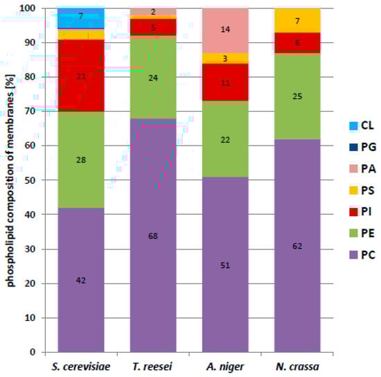 Phospholipid class composition of membranes from yeast and filamentous fungi. PA—phosphatidic acid; PC—phosphatidylcholine; PE—phosphatidylethanolamine; PG—phosphatidylglycerol; PI—phosphatidylinositol; PS—phosphatidylserine; CL—cardiolipin.