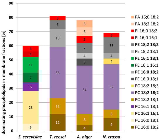 Most abundant phospholipid species in membrane fractions from yeast and filamentous fungi. PA—phosphatidic acid; PC—phosphatidylcholine; PE—phosphatidylethanolamine; PI—phosphatidylinositol; 16:0 palmitic acid; 16:1 palmitoleic acid; 18:1 oleic acid; 18:2 linoleic acid; 18:3 γ-linolenic acid.