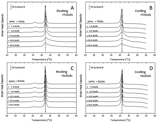 Influence of dolichols on thermal properties of 1,2-dipalmitoyl-sn-glycero-3-phosphatidylocholine (DPPC) membranes. Differential scanning calorimetry (DSC) of multilamellar vesicles (MV) obtained in the heating (A,C) and cooling (B,D) modes for TrDols (A,B) and ScDols (C,D) are shown. Scans were obtained at the rate of 1 °C min−1; representative scans of three independent runs are shown.