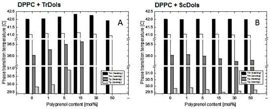 As shown in Figure 7A,B, dolichols isolated from Trichoderma, TrDol, significantly altered the thermotropic phase behavior of the MVs. The height of the main melting peak decreases progressively with an increasing dose of TrDol, which was accompanied by its progressive broadening. Such changes indicate that dolichols strongly decrease the cooperativity of the main phase transition, while the enthalpy changes by no more than 7% (Table 4). Moreover, the peak becomes asymmetric, especially when the dolichol/DPPC molar ratio exceeds 15 mol%. In agreement with the small ∆H change, the Tm is weakly affected: it increases slightly up to 15 mol% and then drops below the Tm of pure DPPC for 50 mol% (Table 4, Figure 8).