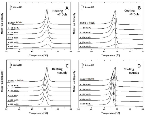 Figure 8 shows similar thermograms obtained for DMPE MVs. As reported previously [33], DMPE in a well hydrated state presents a single and strong transition peak corresponding to the gel-to-liquid-crystalline phase transition. In our DSC experiments it was found at 50.67 °C upon heating, with a transition enthalpy of 22.84 kJ·mol−1 (Table 5). Upon cooling (Figure 9B,D), the peak becomes shifted by 1.41 °C and broadens markedly.