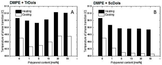 Influence of concentration of dolichol on phase transition temperature of DMPE membranes. Phase transition temperature of DMPE multilamellar vesicles obtained in the cooling and heating modes for TrDols (A) and ScDols (B).