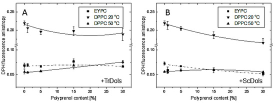 Dolichols, especially those from yeast, fluidize the highly ordered DPPC bilayer at 20 °C, when it is in the gel state. Conversely, they exert a stabilizing effect at 50 °C, i.e., on the liquid-crystalline state, and in this case the Trichoderma dolichols (Figure 11A) are more effective. Both these effects are concentration-dependent. On the other hand, the egg yolk lecithin (EYPC) bilayer studied above its phase transition temperature was virtually unaffected by TrDols and slightly destabilized by ScDols.