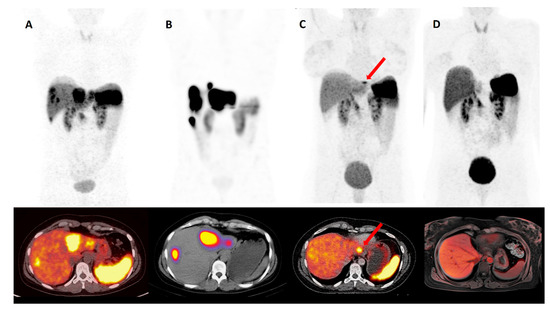 A 38-year-old woman with NET of the rectum G3 (Ki-67 in hotspots up to 25%) with hepatic and locoregional lymph node metastases. Pretherapeutic (A) and post-therapeutic (C) 68Ga-DOTATAOC-PET/CT. After interdisciplinary tumor board decision, 1st cycle PRRT with 7.4 GBq 177Lu-DOTATOC (B). After three cycles of PRRT, only one remaining hepatic lesion in segment II (C, red arrow head) is left. Following a curative approach, the patient underwent a laparoscopic left-lateral liver resection. The patient is currently undergoing semi-annual screening at complete response (CR) 68Ga-DOTATAOC-PET/MR (D).