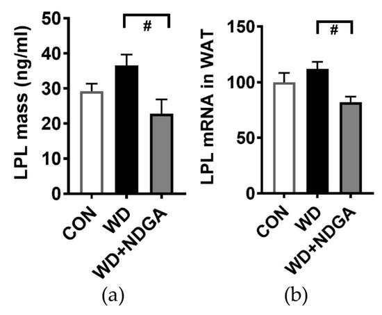 Effects of nordihydroguaiaretic acid (NDGA) on low-density lipoprotein (LPL) mass and LPL gene expression in db/db mice: (a) LPL mass by ELISA; (b) LPL gene expression by qPCR in adipose tissue. Data are represented as the mean ± SEM of three independent experiments. # p < 0.05, compared with the Western diet (WD) by one-way ANOVA, with Tukey’s comparison test. WAT: White adipose tissue.