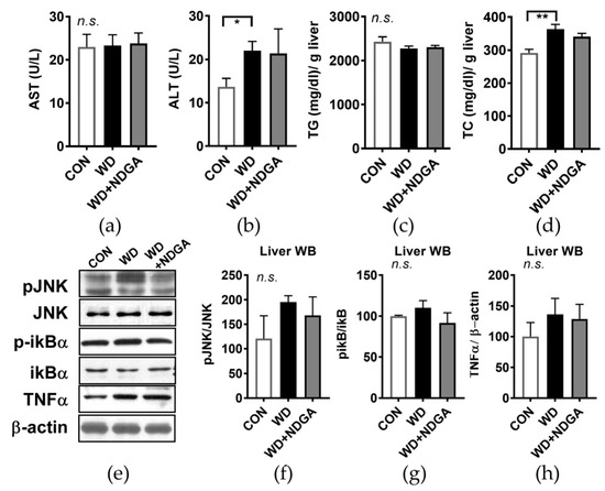 NDGA supplementation did not alter hepatic stress signaling. Six-week-old male db/db mice were fed with a control (CON, white bar), WD (black bar), or WD+NDGA (grey bar) diet for 12 weeks (n = 10 per group): (a) aspartate aminotransferase (AST) U/L; (b) alanine aminotransferase (ALT), U/L; (c) triglyceride (TG) contents in liver, mg/dl/g liver; (d) total cholesterol (TC) contents in the liver, mg/dl/g; (e) hepatic western blot analysis of phosphorylation of c-Jun N-terminal kinases (JNK), phosphorylation-inhibitor kappa B (p-ikB), and tumor necrosis factor alpha (TNFα) in CON-, WD-, or WD+NDGA-fed db/db mice; (f) triplicate of western blot analysis of pJNK/JNK; (g) triplicate of western blot analysis of p-iKB/iKB; and (h) triplicate of western blot analysis of TNFα/β-actin. Data are expressed as the mean ± SEM (n = 10). * p < 0.05; ** p < 0.01, compared with the CON, by one-way ANOVA, with Tukey’s comparison test.