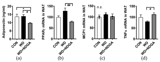 To determine whether the inclusion of NDGA alters adipose tissue metabolism and adipose inflammation, serum adiponectin levels and several inflammatory gene expressions were measured in epididymal fat. A marginal increase of fat mass (Figure 2) was associated with lowered plasma levels of adiponectin levels in the WD+NDGA group, compared to the WD group (Figure 5A). Consistently, the adipocyte-transcription factor, peroxisome proliferator-activated receptor gamma (PPARγ), was also down-regulated by NDGA, compared to the WD group (Figure 5B). Despite there being no differences in monocyte chemoattractant protein-1 (MCP-1/CCL2) expression (Figure 5C)—which is one of the key chemokines that regulate the migration and infiltration of monocytes/macrophages, in the NDGA group—pro-inflammatory gene expressions, such as TNFα, were increased by NDGA in epididymal adipose tissue (Figure 5D). This suggests that LPL inhibition increased inflammation in adipose tissue.