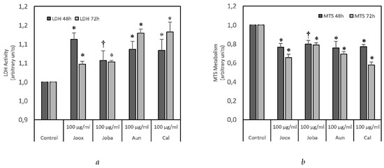 Screening of antitumor activity. HT29 cells were exposed to 100 µg/mL of total protein extract from Juniperus oxycedrus subsp. oxycedrus (Joox), Juniperus oxycedrus subsp. badia (Joba), Arbutus unedo (Aun) and Corema album (Cal), for 48 and 72 h. Saline containing 2 mM CaCl2 and 2 mM MgCl2 was used as control. General cell death (a) and cell viability (b) were evaluated by LDH release and MTS metabolism assays, respectively. Results are expressed as mean ± SEM fold-change to control from three independent experiments. * p < 0.01 and † <0.05 for HT29 cells.