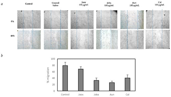 After determining the inhibitory activities on HT29 colon cancer cells by all species under study, the potential to inhibit the metastatic activity of these cells was analyzed using the migration assay, which shows the ability that cells have to invade an open gap (wound). Unlike the control, in the presence of an efficient inhibitor, the cell gap does not close after 48 h. In Figure 2 we can observe the pattern of HT29 cell migration after 48 h exposure to protein extracts from Joba, Joox, Aun and Cal, and the respective representative images of the highest inhibitions.