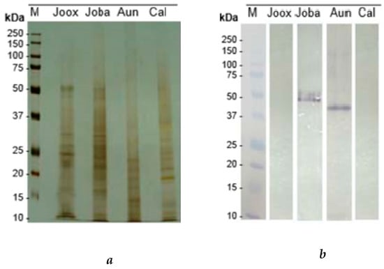 Glycoprotein detection in protein leaves extracts. Polypeptide profile of Juniperus oxycedrus subsp. oxycedrus (Joox), Juniperus oxycedrus subsp. badia (Joba), Arbutus unedo (Aun) and Corema album (Cal) leaves extracts in a 17.5% SDS-PAGE-R (m/v) acrylamide, stained by AgNO3 as gel control. It was applied 7µg of each extract and 3µg of molecular marker (a). Transfer and glycodetection in a nitrocellulose membrane of leaves extracts: were transferred 540 μg of Joox, 700 μg of Joba, 350 μg Aun and 400 μg of Cal, of the respective extracts (b).