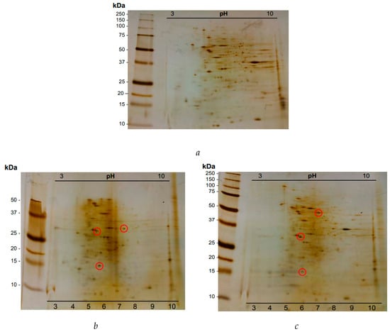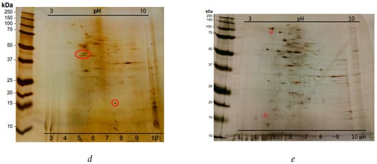 Juniperus oxycedrus subsp. badia extract evidenced 3 peptide spots (Figure 5c). The spots with pIs close to 6.0 reveal the same molecular mass of the spots identified in Figure 5c, and may indicate a characteristic spot, like a molecular marker, of the proteomic profile of Juniperus oxycedrus species. The third spot comprises a molecular mass of approximately 50 kDa, with a pI close to 7.0.