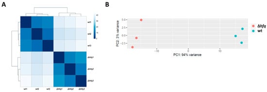 Clustering of transcriptomic data. (A) Heat map showing hierarchical clustering of the Euclidean sample-to-sample distance between transcriptomic profiles of wt and Δhfq mutant. (B) Principal component analysis was applied to transcriptomic profiles of the wt strain (blue circles) and Δhfq mutant (red circles). Each dot represents an independent biological replicate.