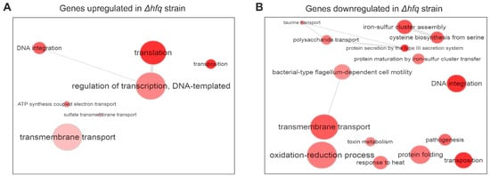 Gene ontology (GO) term analysis of genes significantly downregulated (A) or upregulated (B) in the Δhfq mutant. Significantly enriched terms from the domain ‘Biological processes’ and their catenations are summarized and visualized by REVIGO as an interactive graph. Circle size encodes number of genes associated with respective category and red shades encode the significance level of the enrichment.