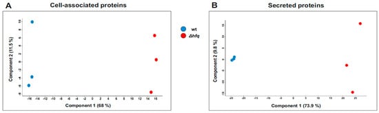 Principal component analysis (PCA) of proteomic samples. PCA was applied to protein profiles of the wt strain (blue circles) and Δhfq mutant (red circles) determined in corresponding cell-associated (A) or secreted (B) protein fractions. Each dot represents an independent biological replicate.