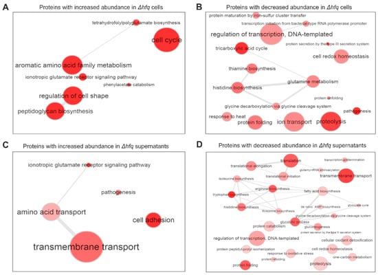 GO term enrichment analysis of genes either significantly upregulated (A,C) or downregulated (B,D) in the Δhfq cells and Δhfq culture supernatants, respectively. Biological processes significantly enriched for genes belonging to corresponding functional category are shown as an interactive graph. Significantly enriched terms from the domain “Biological processes” and their catenations are summarized and visualized by REVIGO. Circle size encodes number of genes associated with respective categories, red shades encode the significance level of the enrichment.