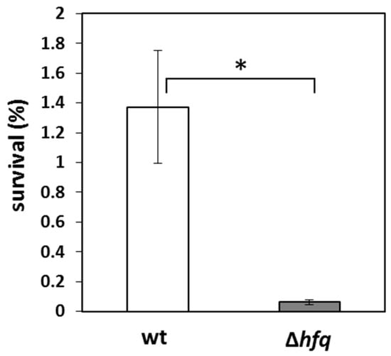 Noticeably, one of the virulence factors displaying consistently reduced expression, production and secretion in the hfq mutant was the autotransporter Vag8. The Vag8 protein binds and recruits C1 esterase inhibitor and thereby inhibits complement activity and contributes to serum resistance [32,33,34]. Therefore, we asked whether the reduced production of Vag8 factor would compromise the capacity of the Δhfq strain to evade complement-mediated killing. When compared to recent isolates, Tohama I strain exhibits high susceptibility to serum killing [34], nevertheless, in line with our assumption, the survival of the hfq mutant (0.06% ± 0.01%) was dramatically decreased when compared to the wt strain (1.36% ± 0.38%) (Figure 5).
