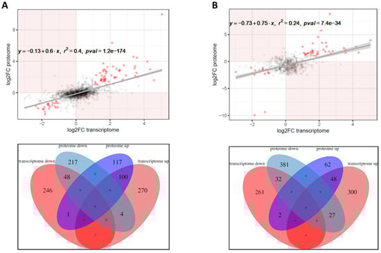 Considering previous reports, the correlation between RNA-seq and LC-MS/MS analysis of cell-associated proteins was relatively high (r2 = 0.40, p-value 1.2 × 10−174) with 148 proteins displaying same trend in abundance as corresponding genes in transcriptomic profiling (Figure 6A). As shown in Figure 6B, the concordance of RNA-seq data with secretome analysis was much less positive (r2 = 0.24, p-value 7.4 × 10−34) with only 80 proteins showing similar trend between both analyses. Of note, among genes showing strong correlation with both proteomic datasets were those encoding the T3SS apparatus, pertussis toxin and its transport machinery, ABC, TRAP, and TTT transporters and other proteins involved in the primary metabolism. Apparently, highly modulated genes showed better correlation with abundance of corresponding proteins than those for which the expression was changed only slightly above the thresholds of significance.