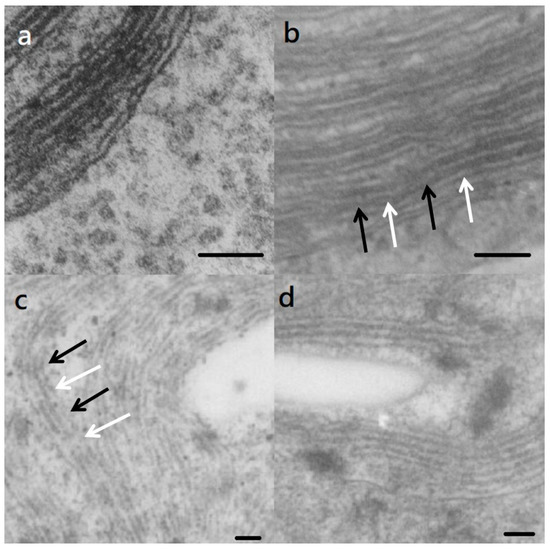 Transmission electron micrographs of the thylakoids of (a) freshly harvested S. vacuolatus (control) cell and the cells that had been heat-treated and then cultured under illumination for (b) 6 h, (c) 24 h, and (d) 72 h. Bars = 100 nm. The light and dark segments are indicated by white and black arrows, respectively.