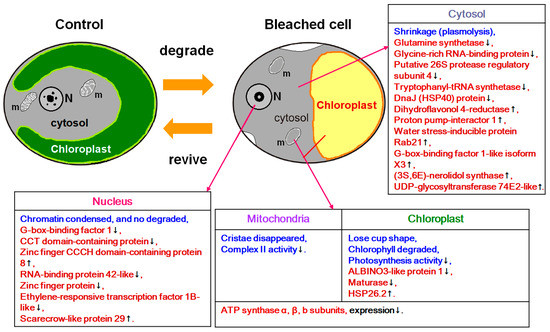 Our findings can help to explain how algae survive and reproduce in the transition of environmental stress. The bleached cells in this study were found to down-regulate many biochemical activities and, in the meantime, activated some stress response proteins to survive the damage that is incurred by stress treatment. These changes in proteins’ expression pattern might elucidate many phenomena observed in the previous study [14].